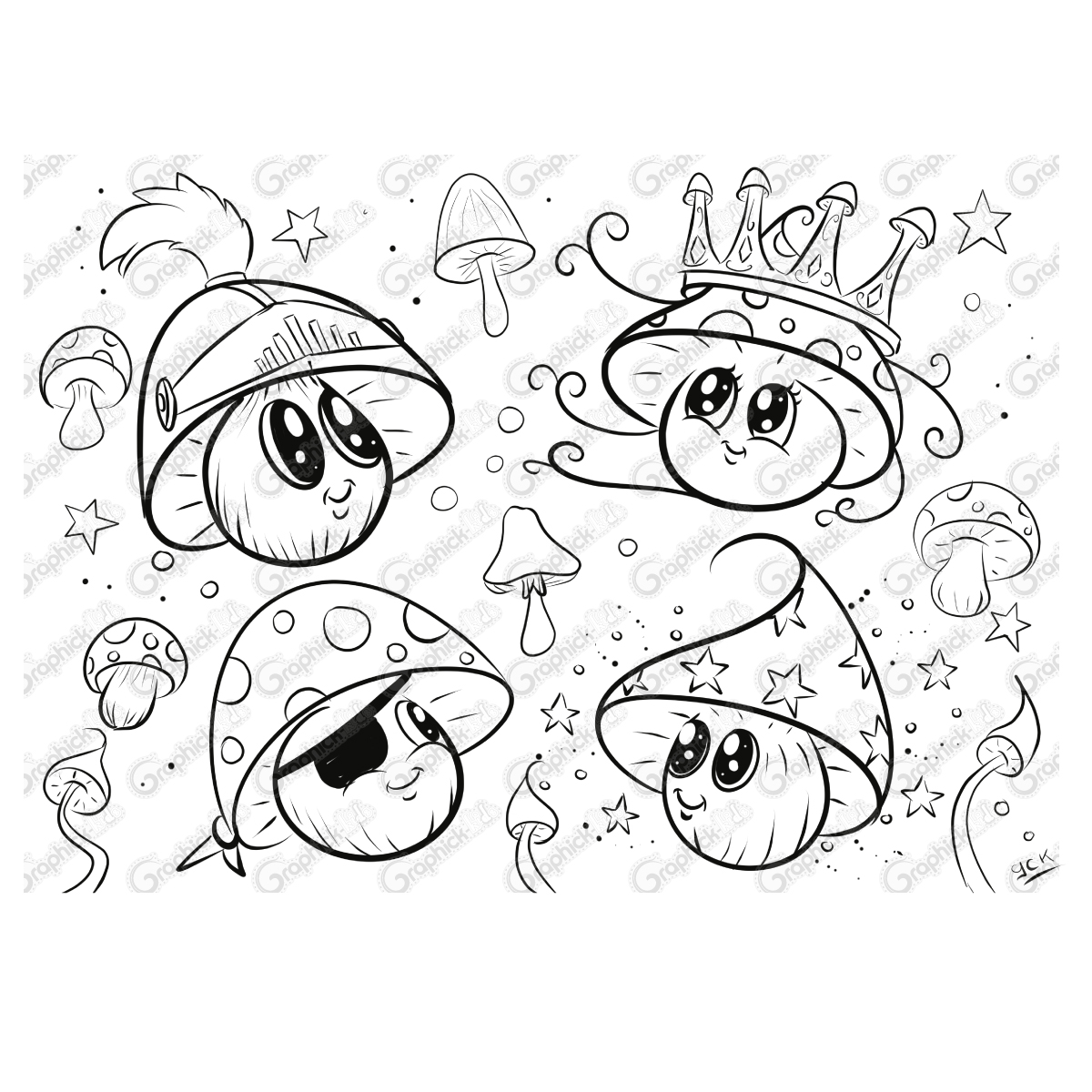 Découvrez un coloriage unique et original mettant en scène des champignons humanisés aux visages expressifs et aux costumes héroïques !